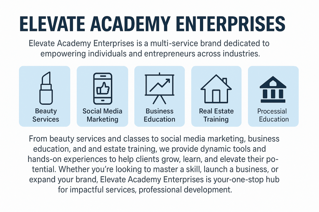 Elevate Academy Enterprises is a multi-service brand dedicated to empowering individuals and entrepreneurs across industries. From beauty services and classes to social media marketing, business education, and real estate training, we provide dynamic tools and hands-on experiences to help clients grow, learn, and elevate their potential. Whether you’re looking to master a skill, launch a business, or expand your brand, Elevate Academy Enterprises is your one-stop hub for impactful services, professional development, and practical education.